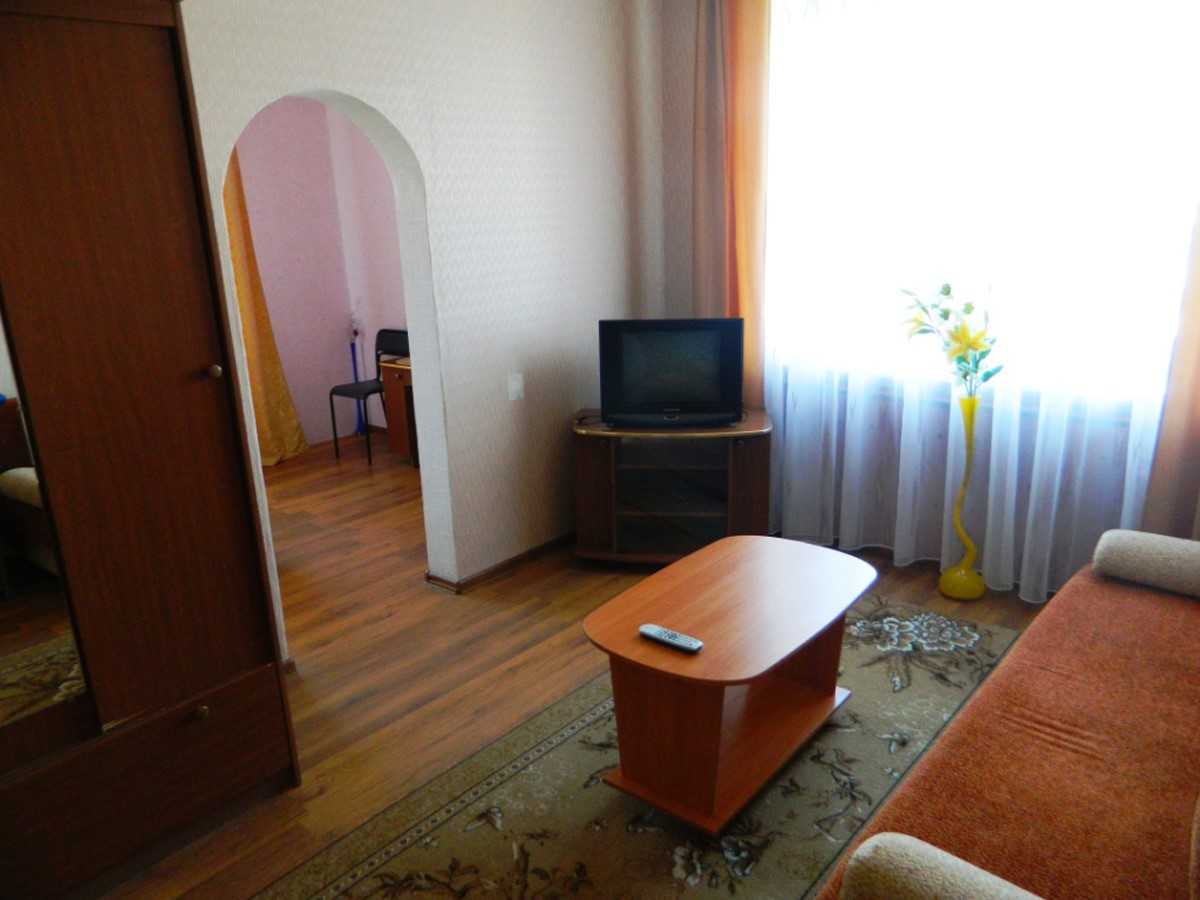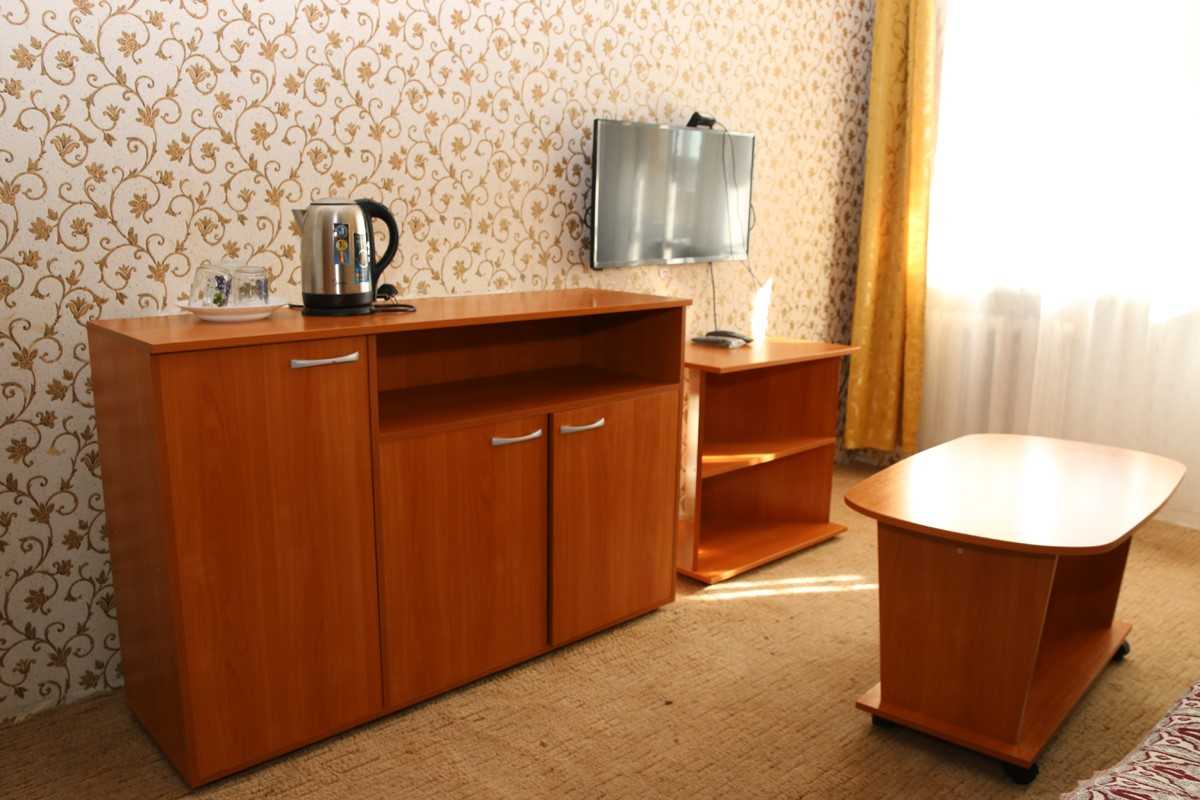 3 осн. места. 1 доп. место. Мебель: вешалка, диван раскладной, зеркало, кровати односпальные, прикроватные тумбочки, столик журнальный, стулья, шкаф. Оборудование: набор посуды, телевизор ЖК, чайный набор посуды, электрочайник. Санузел: с ванной, туалетные принадлежности. Сервис: Wi-Fi бесплатно, смена полотенец, смена постельного белья, уборка номера.